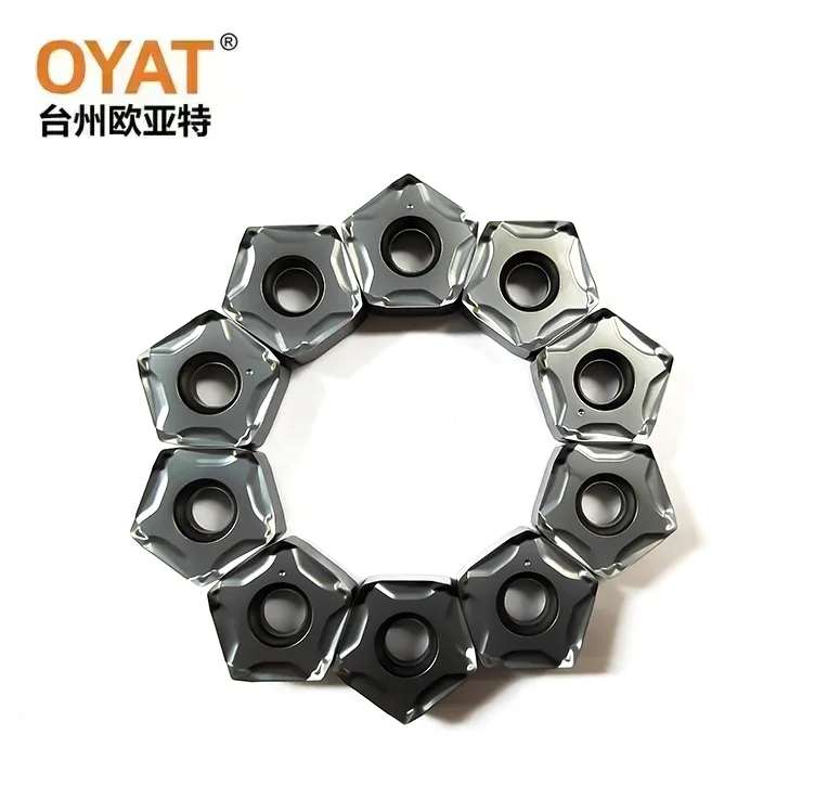 OYT PNMU0905XER-GM-fræsningsindsatsen har en ultra-fine-kornet cementeret carbidmatrix integreret med høj styrke sejhed og slidbestandige belægninger. Gennem præcisions sintring og varmebehandlingsprocesser opnår det aninsert ideel balance mellem høj påvirkningsmodstand og slidholdbarhed. Indsætoverfladen er coatet med en flerlags sammensat belægning, der effektivt forbedrer oxidationsmodstand og anti-scorende kapaciteter, hvilket sikrer overlegen ydeevne, selv under højhastighedsfeedforhold. Dette indsats kan pålideligt behandle forskellige materialer under HRC38-hårdhed, herunder stål med lavt kulstofindhold, legeringsstrukturelle stål, austenitiske og martensitiske rustfrie stål, gråt støbejern og duktilt jern. Dens unikke femkantede dobbeltsidede design giver 10 effektive skærekanter, der tilbyder enestående omkostningseffektivitet. Det er især velegnet til grov bearbejdning af store kvoter på fly, tunge fræsningsoperationer og ru drejning af trinede overflader i bearbejdningscentre og gantry fræsemaskiner. Selv under intermitterende skæring og høje effekt-forhold opretholder den enestående erosionsmodstand og chipkontrolfunktioner.